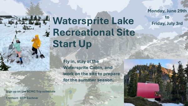 Participants will fly in to Watersprite Lake and stay in the BCMC Cabin along with a Rec Sites & Trails BC work crew to prepare the Rec Site for the July 1st opening. You will be hiking out. We will focus on shovelling snow off of the tent platforms, clearing the scramble route around the lake to the camping area, and making repairs. Carpooling will be finalized as we get closer to the date. All you will need to take up is your smile, food, sleeping bag and pad, and clothes. Since we are flying in you can pack your favourite food and beverages! The hut is fully stocked with dishes, utensils, pots and pans, and Coleman stove.